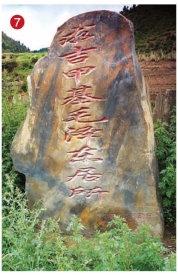 进村寻毛泽东居所,沿水泥路行驶约150米,停车向村民打听,村民热情地带我们走上村头梯田似的半坡田头。在田头,就能看见几乎淹没在荒草里的“求吉甲基毛泽东居所”水泥碑了(图7)。碑上是“甲基”,和路边牌子上的“甲吉村”有一字之别。