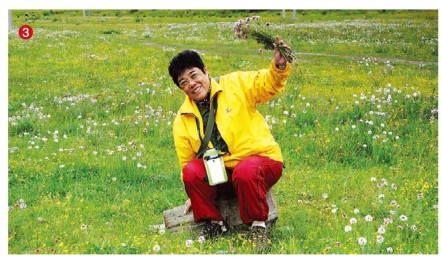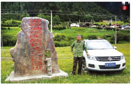 途中,我们最先看见的是达来村(下包座)路牌,再前行约1公里,就是“俄若塘包座战役庆功会场遗址”碑(图2),在路边、村头的一片鲜花盛开的平地上。我们就地采花,然后在纪念碑前敬献一束鲜花。沿途都是谷地,土地并不富余,但藏民们依然为纪念碑留出了一大片空地。空地上遍是天然的绿草鲜花,让姐姐田晓虹乐不可支(图3)。