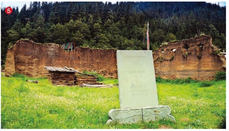 达金寺已经残破,残垣断壁的遗址在包座战役达金寺战斗遗址碑的右侧。在包座战役达金寺战斗遗址碑旁边还有“包座战役遗址”石碑(图5)。