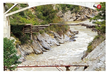 站在茨日那村旁的公路边,公路下边就是白龙江,跨越白龙江有3座桥:位置最高的水泥单孔桥(高处)是新修建的;水泥大桥下方是伸臂式木桥;木桥下方还有一座钢框架结构的木板桥。这座伸臂式木桥即仙人桥。也叫红军桥,是毛泽东当年走过的桥(图8)。木桥两端的桥架完好,伸出的桥面只剩两根木椽了。