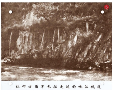 当红二、四方面军出达拉沟后,往尼傲、旺藏、麻牙寺一线行进,因先头部队与当地的土官、头人交涉好了,互不侵犯,所以没有遇到人为阻碍。红四方面军长征走过的栈道留有老照片(图5)。