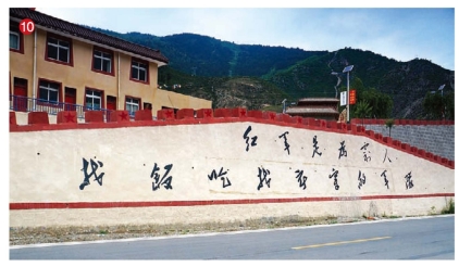 在村子路边的斜坡上,用毛泽东的手书字写着“红军是为穷人找饭吃找衣穿的军队”大幅语录(图10),可能是毛泽东在茨日那村住宿的日子里说的话。这句话,我们在以前的长征路途中已经多次在红军标语上看到了。
