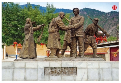 离开茨日那村,我们在迭部县城住宿了一晚。县城里的文化广场上,竖立着2012年党的生日前夕落成的“毛主席在迭部”大型雕塑(图15)。雕塑高15米、宽11米,生动地再现了红军长征经过迭部时,毛主席和迭部人民在一起的场景,表现了长征精神薪火不熄、代代相传的主题。雕像创作者是甘肃省工艺美术大师、著名雕塑家张春阳,他多次走访长征路沿线健在的老红军、藏族群众,历时5年易稿数百次,最后确定了这部作品的主题内涵。