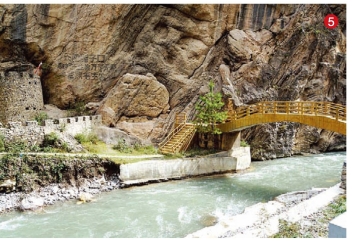 腊子口战役旧址也在路右边(图5),向前走,离腊子口战役纪念碑不远。翠绿色的腊子口河水从沟底涌出,水流依然湍急。当年战斗时红军冲过去的那座小木桥经“复原”后成了水泥桥,还漆成了黄色。敌重兵据险扼守的碉堡仍在对岸桥头(在杨成武回忆录里应该有两座桥头碉堡)。桥边的崖壁上还留有“文革”时期的标语“敬祝毛主席万寿无疆”。