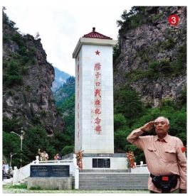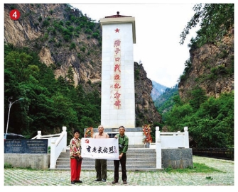 我们先看到路左边的大型雕塑“激战腊子口”。接着到达路右边竖立着的腊子口战役纪念碑,由杨成武题字。姐弟中的大弟田毅最激动,看到自己心目中的英雄之地啦!抢先留个影(图3)。