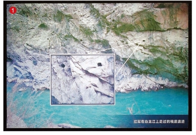 9月16日,中央红军一部沿白龙江北岸前进,向腊子口方向(东北方向)前进。红军在白龙江北岸走过的栈道还有遗迹(图1)。沿途的藏族同胞帮助过红军修复栈道。