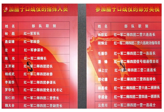 我们不要忘记,迂回登崖顶部队中的一个贵州籍苗族战士,人称“云贵川”,这个名字已经出现在飞夺泸定桥的22名勇士名单中;担负迂回歼敌的一连的连长,正是突破乌江的英雄连长毛振华(他在即将到达吴起镇前牺牲);担负正面进攻的六连是来自红四方面军的部队——1935年6月下旬,红四方面军第三十三军在川西毛儿盖、松潘地区与红一方面军一军团会师,三十三军九十八师二九四团奉命补充红一军团第二师,编为四团二营。红四方面军指战员们编入中央红军后的首战,担任了正面主攻!战斗中,六连指导员胡炳云身负重伤(后来任第三野战军二十九军军长,参加了解放上海市的战役,新中国成立后曾任兰州军区副司令员)。参加腊子口战役的指挥人员和部分英模有列表(图8)。