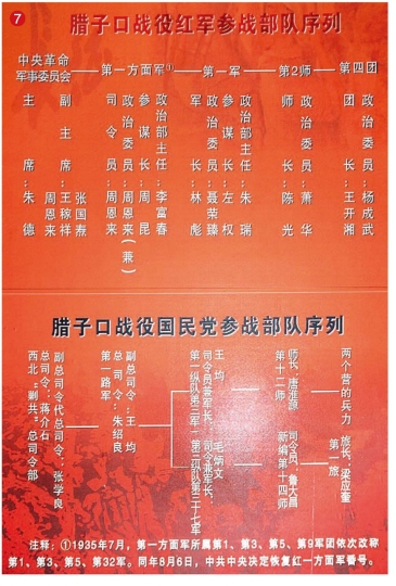 整个隘口和小桥成为瓶颈,对于进攻的一方,无法展开兵力和武器。为了打通红军北上通道,必须尽快夺取腊子口。毛泽东在茨日那已下达了“以三天的行程夺取腊子口”的命令,攻击任务交给了红一军二师四团(准确地说,按照此时编制应是陕甘支队一纵队四大队),这支英雄的部队在长征后期途中一直是开路先锋。腊子口战役红军参战部队序列与国民党参战部队序列有列表(图7,注意:这个表中的红军参战部队编制序列是不合适的,应该按照陕甘支队的编制。)
