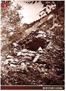 抬头望去,腊子口的崖壁陡峭,依旧高耸。走过桥去,细看崖壁上的弹痕密密麻麻,有的弹洞深可容下手指。现在圆柱形的桥头碉堡显然是后来修建的,原先的碉堡被红军用手榴弹炸得“开天窗”了(图6)。