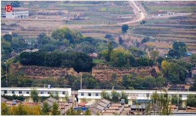 离开榜罗镇时,我们特意在山坡高处远观镇中的当年中央警卫团驻地旧址(图12),就是那个长了许多树的圆形土围子。这确实是一个便于观察、便于发挥火力的位置。