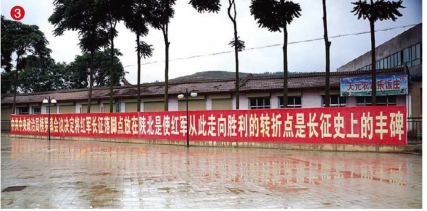 我们在纪念馆前的广场上停车,回头就看见栅栏墙上的大幅红底黄字标语中共中央政治局榜罗镇会议决定将红军长征落脚点放在陕北是使红军从此走向胜利的转折点是长征史上的丰碑(图3)。