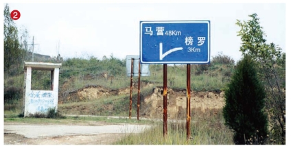 见到直行去马营、右转去榜罗(图示3km)的岔路口(图2),就得右转了。右转后下坡3公里,就进入榜罗镇了。
