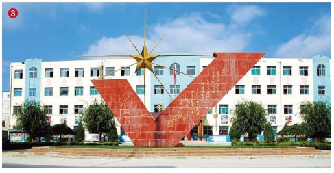校园的院子里最醒目的就是“毛泽东发表《七律·长征》纪念碑”(图3),这是2000年毛泽东《七律·长征》诗发表65周年之际,上海电视台捐资与通渭县人民政府在文庙街小学共建诗碑,巨大的“V”字形建筑上是《七律·长征》毛泽东手书全文和陕甘支队经过通渭的路线图,“V”字形建筑中间是一颗金色五角星。诗碑旁的不锈钢铭牌上写“毛泽东同志首次朗诵《七律·长征》的地方”。