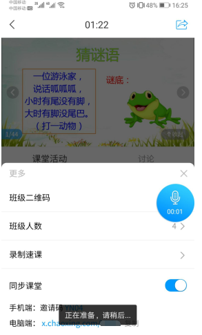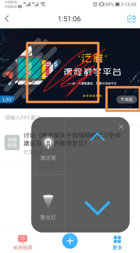 A.点击移动端PPT投屏页右下角【更多】,将【同步课堂】功能开启。将手机端和电脑端的参与方式分享给不在现场的说课活动参与人。其他教师便可远程加入线上说课活动,时时收看并参与互动。