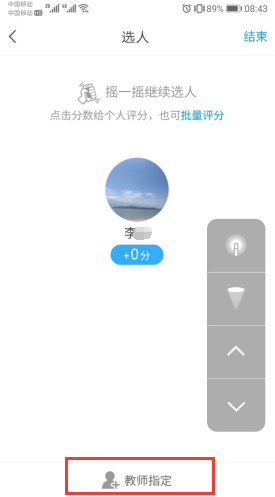 D.选人评分。说课过程中,主备教师可以通过“选人”活动进行主备教师与从备教师的互动,增强说课活动的趣味性。选人方式分为随机选人和指定选人。点击PPT页下方“+”中的“选人”活动,以输入或拍照方式添加选人是由,便于活动记录回顾。点击“发起选人”,可通过摇一摇随机选人方式从从备教师班级里随机选人互动,也可点击“教师指定”按钮,指定选中某位从备教师互动。选人结果同步投屏在电脑屏幕上。针对被选出的对象,可根据互动情况给予积分奖励。主备教师可继续选人互动或结束活动。选人结果和积分将计入说课活动数据存档。点击右上角“结束”,结束活动,该活动同时被保存至“活动库”。