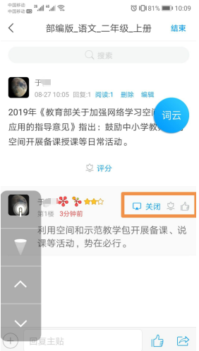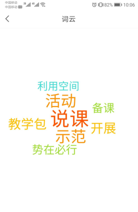 G.主题讨论。说课过程中,主备教师可以通过“主题讨论”活动对讨论过程进行记录,并通过“词云”功能对关键词出现频率进行统计分析和展示,围绕从备教师的重点关注点组织深入的讨论交流;还可对单个从备教师的讨论内容进行单独投屏展示讨论,并给予积分奖励。点击PPT页下方“+”中的“主题讨论”活动,输入讨论主题,点击“立即开始”,即可将该讨论发送给从备教师。讨论结果同步展示在主备教师移动端和电脑大屏端。点击“词云”功能,即可对所有讨论内容进行关键词统计分析,并将统计结果进行投屏展示。点击从备教师讨论回帖的电脑同屏图标,即可将该回帖单独投屏到电脑大屏;主备教师可对该讨论内容进行重点展示,并给予积分奖励。点击“主题讨论”统计结果页右上角“结束”按钮,可结束活动,该活动同时被保存至“活动库”。