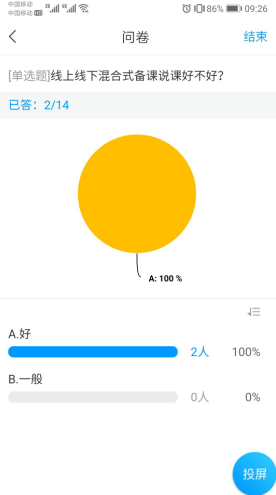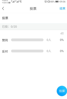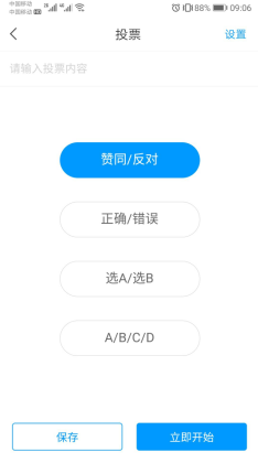 E.投票。说课过程中,主备教师可以通过“投票”活动及时快速的对从备教师的意向选择进行数据统计分析,支持匿名投票,保证投票结果的公平公正。主备教师点击PPT页下方“+”中的“投票”活动,“输入投票内容”或口头描述投票内容,通过快捷方式选择一种回答选项,例如“赞同/反对”“正确/错误”“选A/选B”等,点击“立即开始”,即可将“投票”结果投屏到电脑屏幕上。从备教师投票后,投票进程和分析结果时时在主备教师移动端、电脑大屏端更新展示。点击“投票”创建页右上角“设置”按钮,主备教师还可对投票参数进行设置,比如活动奖励积分、允许参与者查看统计、匿名投票、活动时长。点击右上角“结束”,结束活动,该活动同时被保存至“活动库”。