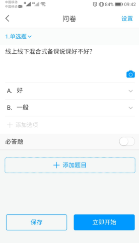 F.问卷。说课过程中,主备教师可以通过“问卷”活动对从备教师的意见进行详细深入的大数据采集分析,并给出分析结果。主备教师点击PPT页下方“+”中的“问卷”活动,输入问卷题目,录入方式可以采用拍照上传、语音转文字人工智能输入法等便捷方式;问卷题型可选择单选题、多选题、问答题;可一次创建多个题目。点击“问卷”创建页右上角“设置”按钮,可设置问卷活动的奖励积分、允许参与者查看统计、活动时长。点击“立即开始”,主备教师移动端和电脑大屏端便可对问卷结果进行分析统计和展示。主备教师可对已答未答情况进行查看,掌握活动进程;可对每道问卷题目选项的选择人数进行排序;可点击题目选项,查看该选项勾选人员;通过左右滑动手机屏幕,可在不同题目统计分析结果间进行切换展示。点击“问卷”统计结果页右上角“结束”按钮,可结束活动,该活动同时被保存至“活动库”。