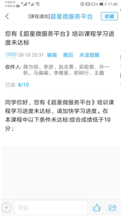 E.发送后管理。可在通知列表中,打开已发送通知,进行编辑、撤回、已读未读信息查看、未读提醒操作。可直接点击“未读提醒”功能,按照发送前的未读提醒设置,一键发送提醒信息。通知支持评论、收藏保存和转发。