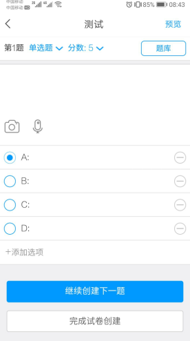 A.创建试卷。点击【考试】栏目右上角“+”,新建一份试卷。可以从“题库”里调取本课程已有试题,也可以新建试题。试题类型支持单选题、多选题、填空题、判断题、简答题。客观试题系统可以自动判分并进行成绩统计分析。支持将试题拍照或录音上传。点击完成即可保存到试卷库。