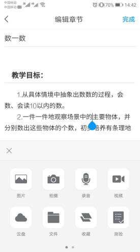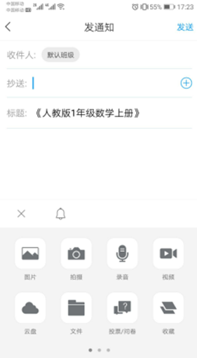 C.通知内容管理。点击左下角“+”,可在内容编辑区添加手机本地图片、视频,添加电脑文件、本机文件,添加云盘、专题收藏、笔记、群聊、小组、速课内资料,支持内容的在线创作和上传,如拍摄、录音、测验、投票问卷、主题讨论、直播、签到、抢答、评分、网页链接、位置。按照每项功能的引导信息,即可轻松完成通知内容的添加。