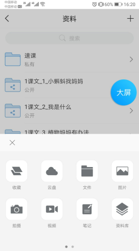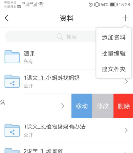 A.资料栏目管理。点击右上角“+”,可以添加资料、批量编辑、建文件夹管理资料。点击“添加资料”,支持添加手机本地图片、视频,添加电脑文件、本机文件,添加云盘、专题收藏、笔记、资料库、网页链接。在“资料库”中,可从公共资源库、和专业资源库中根据关键词搜索试题、教案、课件、素材、音频、视频等资料。根据引导信息操作即可完成资料添加和管理。