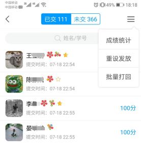 b.点击“已交人数”页右上角三条横线,可对该班级“已交”学生进行成绩统计、重设发放、批量打回操作。成绩统计包括作业内容、正确率、正确及错误学生名单;如果教师对学生整体成绩不满意,可以“重设发放”,学生完成后重新提交;如果教师对个别学生成绩不满意,可通过“批量打回”功能,勾选名单,打回重做。