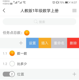 B.单个章节目录管理。点击第一章右侧“+”,可以添加新的章节目录。手指长按第一章条目,可对“章”目录进行重新排序。长按“1.1节”条目,可对“节”目录进行重新排序。向左滑动“章”或“节”条目,可以通过“设置”功能进行章节开放控制管理,通过“插入”功能增加新层级目录等。