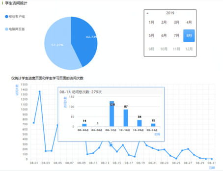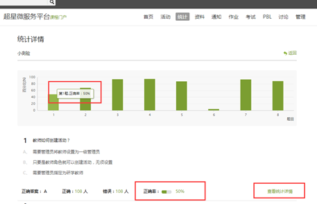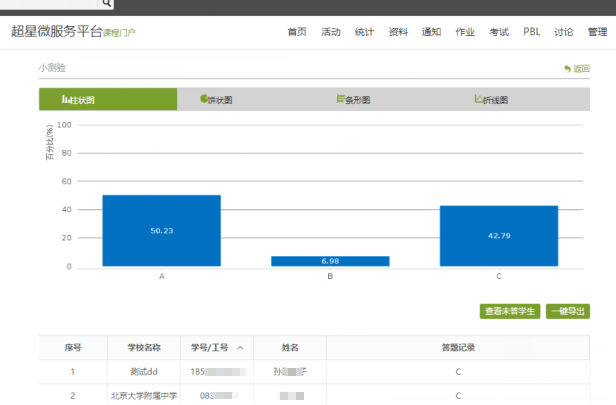 C.统计。点击“统计”,可查看班级测验数据统计结果。包括某个班级在该测验中的每道题的正确率,每道题的学生回答情况统计,未答情况统计。方便教师及时了解学生在预习过程中的知识点掌握程度、薄弱点等。