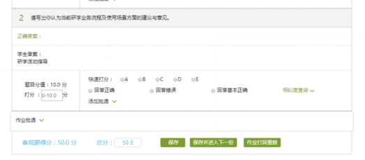 在“章节测验”任务点中,可查看每位学生的完成状态,包括“已保存”“待批”“已批”,并可查看提交时间。教师点击“批阅”按钮,可查看学生客观题测验结果,并对主观题进行批阅。在批阅过程中,支持快速打分、相似度查询、作业批语、作业打回重做等。