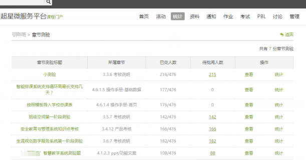 教师可在课程【统计】栏目中对学生预习情况进行查询、统计和互动,包括已发布预习任务点、章节测验、讨论、学习访问量。