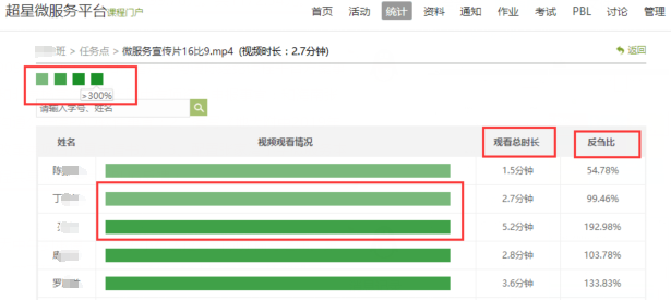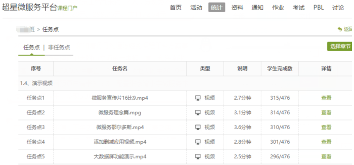 B.详情。点击“详情”,可查看每个学生关于该任务点的完成情况。在视频任务点中,可通过“观看时长”了解每位学生的在某个视频上的学习用时;通过“反刍比”了解学生的完成度、反复观看视频的次数,侧面了解学生对该知识点的兴趣度和掌握程度。