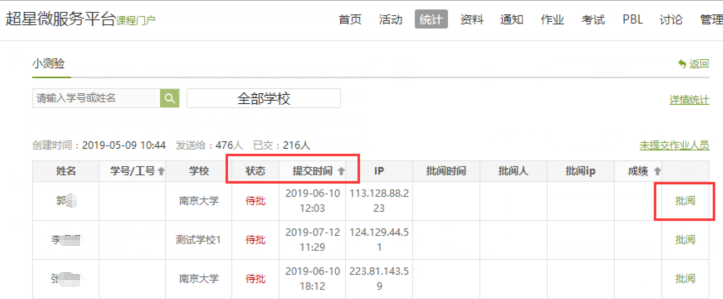 B.查看。点击“查看”,可查看班级内学生的完成状态,并对“待批”测验进行批阅。点击“返回”,可回到上一级页面。
