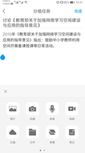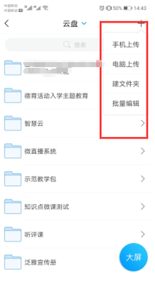 云盘。如果“资料”中的文件无法满足教学需要,教师还可从“云盘”中调取更多文件资源。使用此功能,需要提前将文件资源上传到【云盘】中,方便在示范教学包内各处进行调取。教师可在移动端学习通APP首页【我】中,打开【云盘】,通过右上角“+”里的管理功能进行文件资源的添加和分类管理。使用“电脑上传”功能,可替代优盘,将文件资源存储在云端,可借助手机、电脑随时调用和投屏。