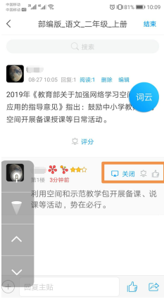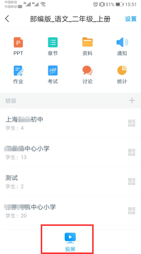 课中教学前5分钟,教师对学生课前预习情况进行回顾和总结,通过查看【统计】数据,表扬预习作业完成情况好的学生,指出预习作业中的共性问题。教师点击PPT页下方“+”中的“章节”活动,将课前预习的章节任务投屏展示。章节中的视频、音频、讨论、测验支持投屏展示。通过上下键滚动翻页;点击移动端章节内的视频或讨论,即可在电脑屏幕上播放展示。