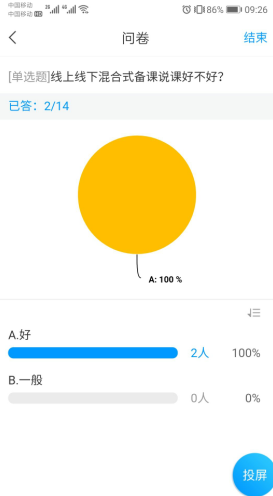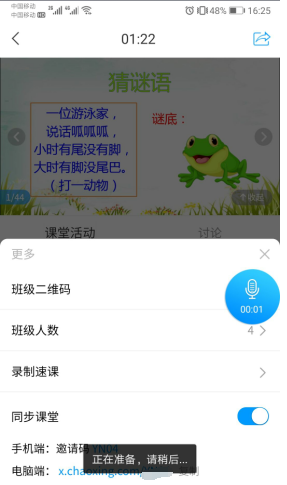 A.点击移动端PPT页右下角【更多】,将【同步课堂】功能开启。将手机端和电脑端的参与方式分享给不在现场的教学活动参与人。其他教室电脑大屏端、移动端便可远程加入线上教学活动,时时收看并参与互动。