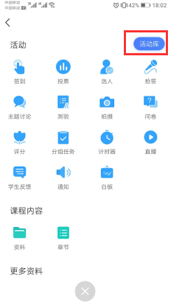资料。“资料”活动可以调取本门课程【资料】栏目中的文件,包括试题、PPT、音视频等。