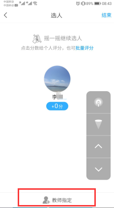 选人。教师可通过“选人”活动进行师生线下互动,增强活动的趣味性。选人方式分为随机选人和指定选人。点击PPT页下方“+”中的“选人”活动,以输入或拍照方式添加选人是由,便于活动记录回顾。点击“发起选人”,可通过摇一摇随机选人方式从班级里随机选人互动,也可点击“教师指定”按钮,指定选中班级内某个学生。选人结果同步投屏在电脑大屏上。针对被选出的对象,可根据互动情况给予积分奖励。教师可继续选人互动或结束活动。选人结果和积分将计入本门课的课中教学活动数据库存档。点击右上角“结束”,结束活动,该活动同时被保存至“活动库”。