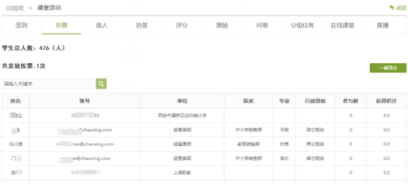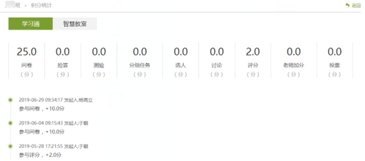 D.课堂活动。教师可在【课堂活动】中查看各项活动的流水单及单项活动内的学生积分排行。便于存档和按照单项活动进行筛选。