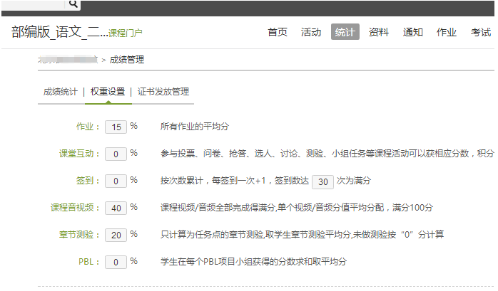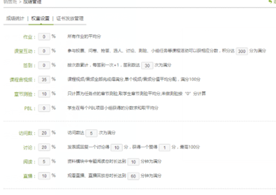 可设置的权重参数包括:作业、课堂互动(参与投票、问卷、抢答、选人、讨论、测验、小组任务等课程活动)、签到、课程音视频、章节测验、PBL、访问数、讨论、阅读、直播、考试、线下。