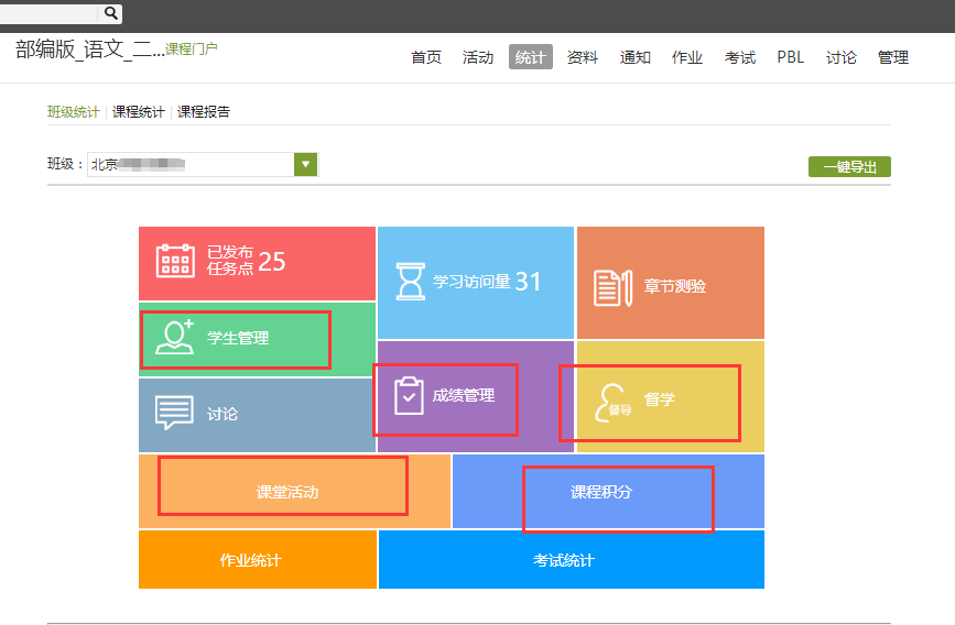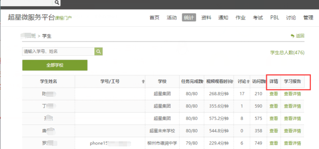A.学生管理。教师可在【学生管理】中可查看班级内每个学生的学习档案。包括任务完成进度、视频观看时长、讨论数、访问量、学习详情、学习报告。