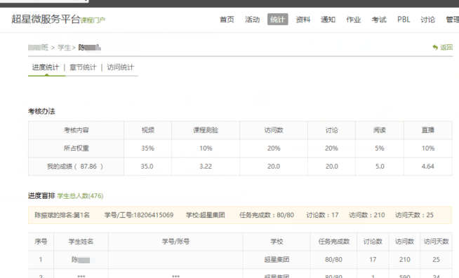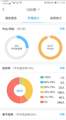 a.学习详情:包括进度统计、章节统计、访问统计。进度统计对学生的课程整体学习进度进行分类统计;章节统计对学生每一节中的任务点完成情况进行统计;访问统计对学生的登录上线趋势情况进行统计。