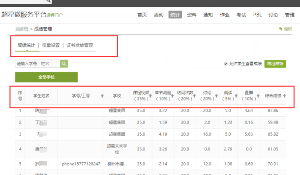B.成绩管理。教师在【成绩管理】中可查看每位学生的课程成绩情况。总成绩由不同权重项目构成,教师可根据评价标准在【权重设置】中设置权重参数。