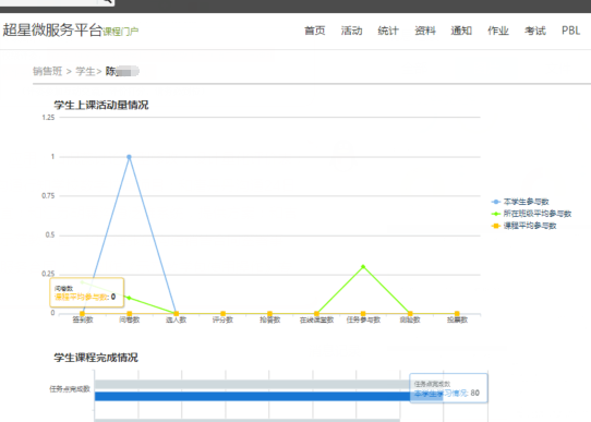 b.学习报告。对每位学生的上课活动量情况、课程完成情况、访问量趋势通过图表形式进行数据对比分析。