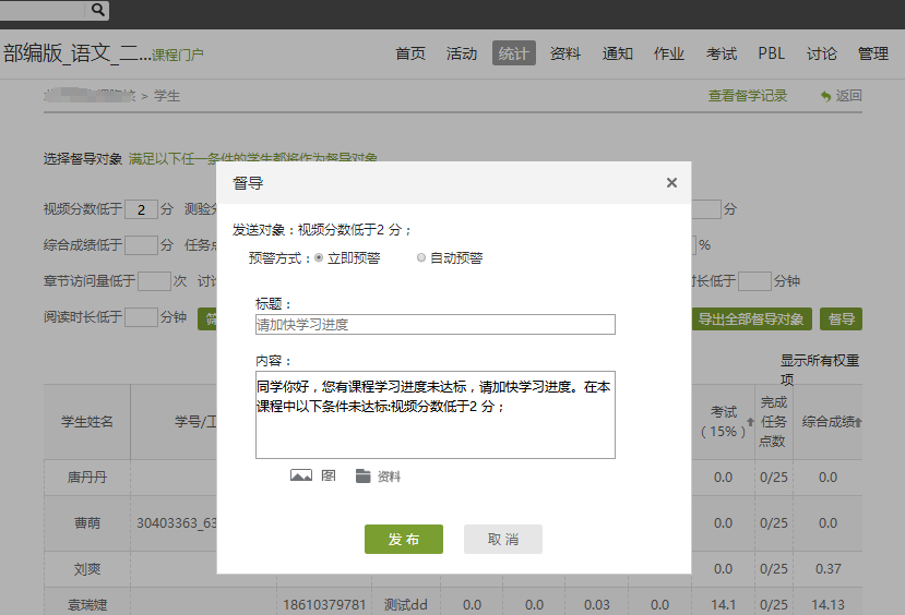 C.督学。教师对教学的管理很大一部分是对学生的管理,【督学】功能为教师定量筛查学生学习数据并督导提供了功能支持。教师可根据自定义考核权重情况进行条件筛选,并发送督导通知。