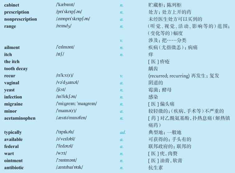 American medicine cabinets contain a growing choice of nonprescription, over-the-counter (OTC)medicines to treat an expanding range of ailments.OTC medicines often do more than relieve aches, pains and itches.Some can prevent diseases like tooth decay, cure diseases like athlete’s foot and, with a doctor’s guidance, help manage recurring conditions like vaginal yeast infection, migraine and minor pain in arthritis.In addition to the substances such as aspirin and acetaminophen that people typically think of as OTC drugs, many other commonly available products are considered OTC drugs by the Federal Food and Drug Administration (FDA).Some toothpastes, some mouthwashes, some types of eye drops, wart removers, first aid creams and ointments that contain antibiotics, and even dandruff shampoos are considered OTC drugs.
