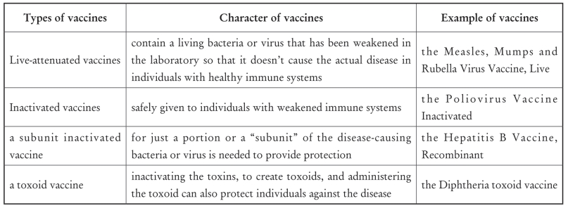 3.There are several types of vaccines:live-attenuated, inactivated (whole or subunit), and toxoids.