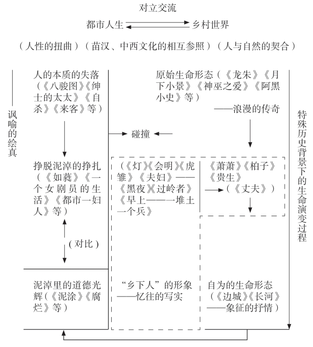 将沈从文成熟期的全部创作作为一个整体,便不难看出沈从文笔下人生世界的基本结构。在这个人生结构中,积淀了沈从文的哲学思辨。这种乡村与都市的对立,从文化的构成看,是都市“现代文明”(即20世纪中国社会的封建文化与资本主义文化的混合体)与原始民性(原始文化的遗存)的对立;从哲学角度看,则是“人性的扭曲”和“人与自然的契合”的对立——从时空角度看,它又表现为现在与过去、未来的对立。这里的现实,是人性扭曲的都市人生图景与湘西乡村社会在时代巨压下的人性变异;这里的过去,是人与自然契合的原始人性;这里的未来,是人性向自然的复归(既保留人性的本来,又具有理性精神的觉醒,加入新的世界竞争)。这种思辨的思想来源,是“五四”以后开始的人的独立与精神解放的思潮(西方文化的积极部分对中国封建专制文化的反拨,是中西文化撞击的产物)与中国传统哲学(主要是老庄崇尚自然的人生哲学——它更多地置根于南方文化传统,而这一传统又恰恰在沈从文所属的南方少数民族文化中得到更多的保留——对儒家文化的惰性部分的反拨,是苗汉文化撞击的产物)相互渗透与融汇的结果。