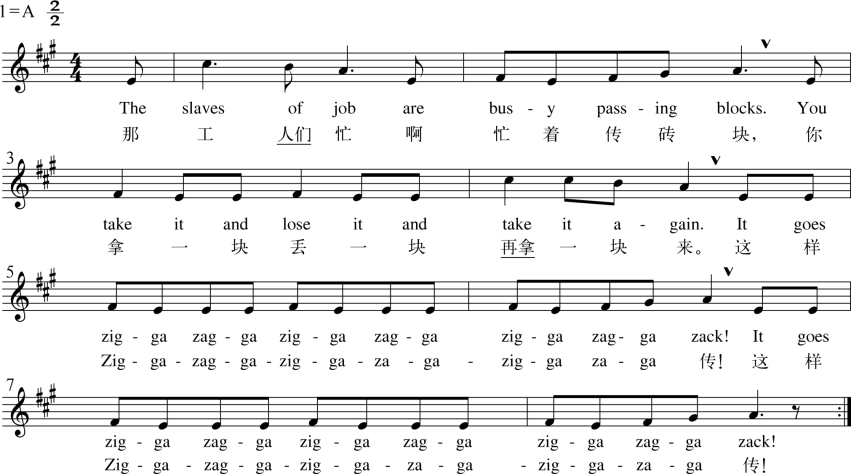 ●随录音演唱,并鼓励学生即兴地加入各种声势。