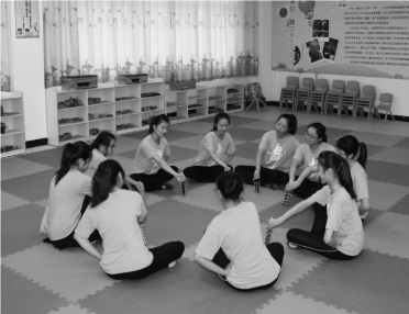 准备:全体学生与老师围坐一圈,人手一件打击乐器(响木或雪铃),作为“砖块”。
